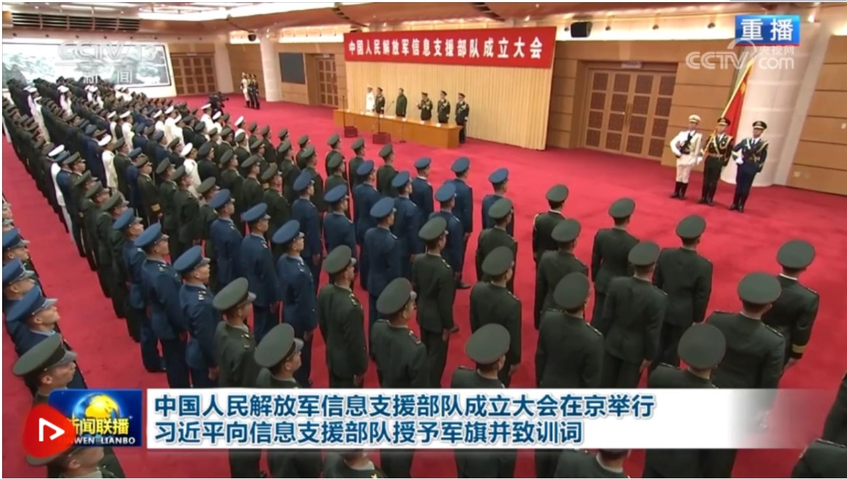 4月19日,中国人民解放军信息支援部队成立大会在北京八一大楼隆重举行。中共中央总书记、国家主席、中央军委主席习近平向信息支援部队授予军旗并致训词。这是习近平致训词。