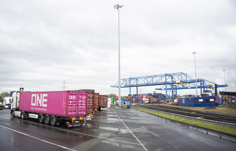 货轮排队停靠,火车鸣笛驶入货运场站,卡车搭载着印有“渝新欧”“义新欧”“西安港”等字样的集装箱往来奔驰……这座莱茵河畔的港口,一派繁忙景象。