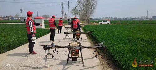 4月19日,睢县周堂镇乔寨村赵永峰流转的1000亩小麦大田里,白楼乡海涛农机合作社飞防队的3架无人植保机正在喷洒农药。