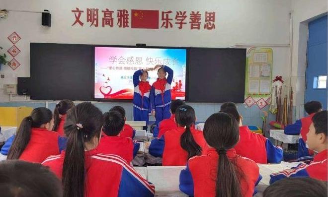 心理班会上,班主任带领学生一起认识感恩、认识成长。本次班会以“感恩”为主线,内容涵盖“感恩父母、感恩老师、感恩祖国、感恩同学”四个环节。