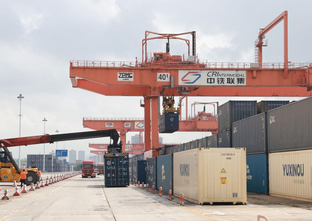 龙门吊不断起降、转运卡车川流不息、火车汽笛声悠扬,各色的集装箱整齐排放,“陆海新通道”的图标引人注目……重庆国际物流枢纽园区到处活力涌动。