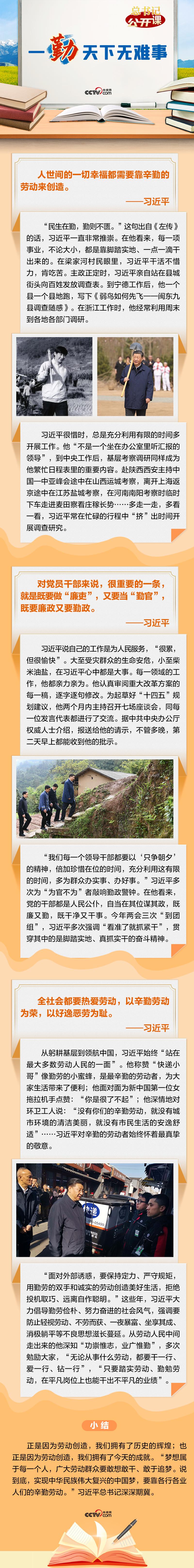 习近平总书记强调,“一勤天下无难事”,“实现中华民族伟大复兴的中国梦,要靠各行各业人们的辛勤劳动”。“勤”是贯穿总书记从政生涯的品质,是对他夙夜在公、勤勉工作最为凝练的概括。