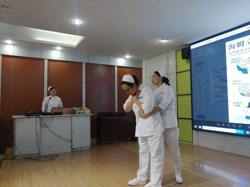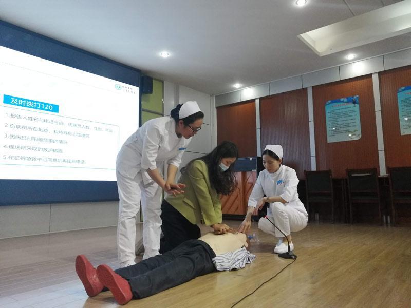 培训会上,该院医护人员为教师们进行了理论讲解,通过PPT和现场示范相结合的方式,重点介绍了急救的黄金救命时间、心肺复苏的定义、海姆立克急救法等方面的内容。教师们学习热情高涨,他们认真听、仔细记,就不理解的知识与医护人员进行现场交流。
