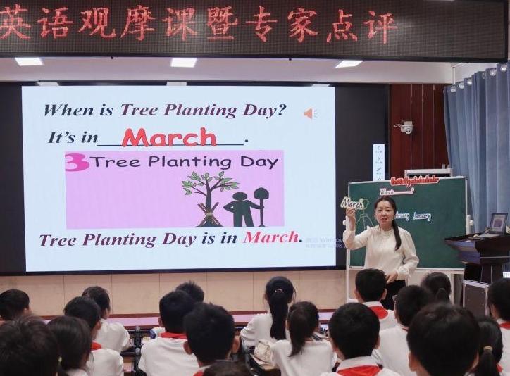 彭皓月老师执教的课题是五年级下册Unit3 《My school calendar》。她教学设计环环相扣,通过每个月份中不同的节日来呈现本节课的核心词汇,利用核心句型和重点单词反复操练,并对学生进行了爱的教育。