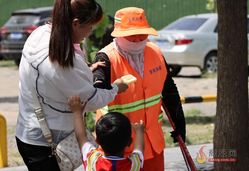 前日下午,在商丘古城内,一名女士拿出一块雪糕送给身旁的环卫工人。雪糕虽小,传递的却是一份关爱。近期天气转热,很多环卫工人依然坚守在街头一线。提醒大家切莫乱扔垃圾,避免增加环卫工人的工作量。