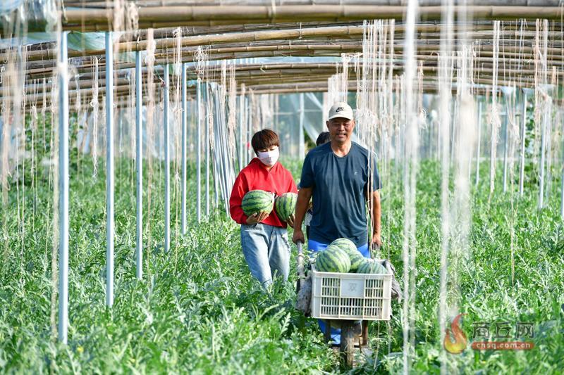 近日,夏邑县北岭镇的西瓜迎来采摘期,放眼望去,一片生机盎然,一个个浑圆饱满的西瓜掩映在绿叶之间。工作人员正忙着摘瓜、装车,田间呈现出一派丰收的喜人景象。近年来,夏邑县以“早佳8424”“美都711”等品种为主的优质西瓜产业,呈现出蓬勃发展的强劲之势,已成为当地助推乡村产业振兴的主导产业。