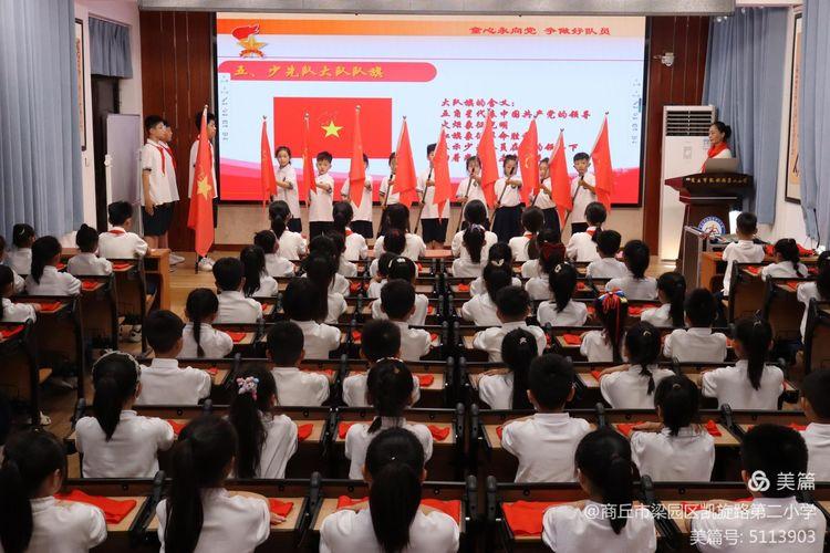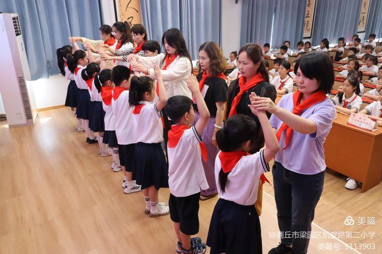会戴红领巾。“领巾披上肩,左尖压右尖,底尖转一圈,岔上拉底尖,底尖穿过圈。”通过练习,同学们能较为熟练地佩戴好红领巾,佩戴不够规范或美观的,考核小老师还及时纠正,入队考核也是一节队教育课。