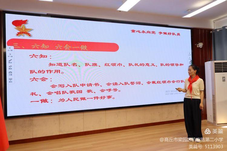红领巾大讲堂。大队辅导员张中华利用“红领巾大讲堂”时间集中一年级八个班的预备队员在学校五楼会议室开展队前教育,通过生动的讲解和互动,带领同学们一起学习了“六知、六会、一做”的内容,大家认真聆听、积极参与互动,表现出对少先队组织的浓厚兴趣和向往。