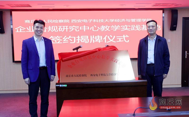 市人民检察院党组书记、检察长王建波(右)与西安电子科技大学经济与管理学院执行院长、教授、博士生导师柴建共同为“企业合规研究中心教学实践基地”揭牌。 本报融媒体记者 王 冰 摄