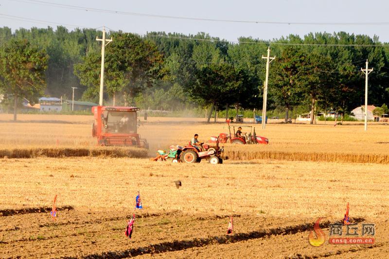 5月28日,睢县凤城街道莲池村麦田内,收割机、旋耕机、播种机在紧张作业,收、耕、播“一气呵成”,构成一幅抢收抢种战“三夏”的火热画面。