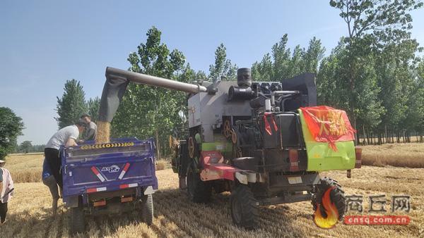 5月27日,在梁园区观堂镇观堂村的麦田里,农机手驾驶收割机收割小麦(上图),村民将收割的小麦装车(下图)。陈臣 摄