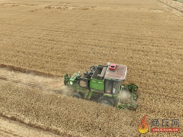 6月5日,收割机在睢阳区闫集镇巴庄村麦田里忙碌。连日来,该村村民抢抓农时开展夏收作业,确保夏粮颗粒归仓。记者 邢 栋 摄