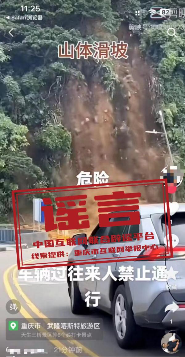 真相:近日,有网民发布了一则“山体滑坡危险,过往车辆行人禁止通行”的视频,视频定位标注为“重庆市武隆喀斯特旅游区”。经重庆市武隆区多部门核实,该区近期未发生大面积山体滑坡事件。网传视频实为2024年6月3日台湾省基隆市中正区潮境公园入口发生的大规模山体滑坡事件,而视频中所标注的定位信息系网民发布视频的地点,而非事件发生的地点。(来源:“重庆辟谣”微信公众号、网信武隆)