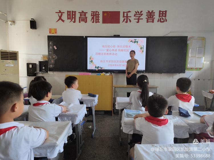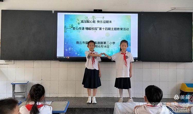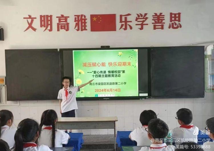 临近期末,一位名叫“焦虑”的小伙伴也悄然而至。有些同学难免会产生紧张、不安等情绪,不利于调动个人的积极性和学习潜能。为帮助同学们顺利度过这一时期,以轻松愉悦的心情面对考试,6月14日,梁园区凯旋路第二小学开展“爱心传递 情暖校园”常态化主题班会。