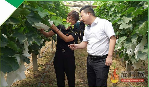 随伸农场的负责人向中原银行夏邑支行行长韩天然(右)介绍葡萄的生长情况。记者 霍天艳 摄