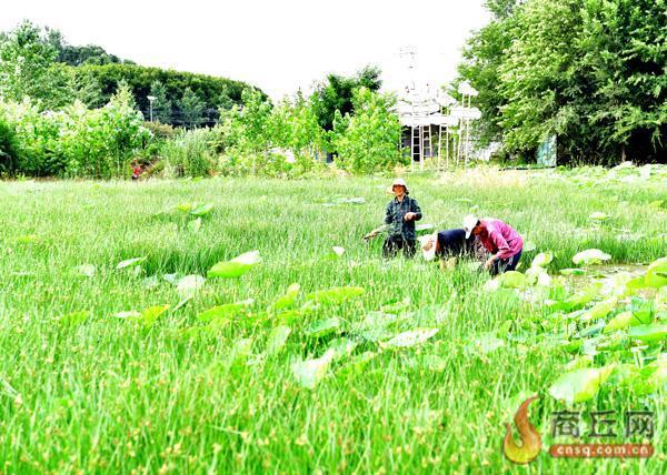 随着气温上升,夏邑县兴旺农场的荷花池内青苔、蒲草生长迅速,既影响了池内水质,又使荷花池景观效果大打折扣。为保障荷花正常生长,6月16日,兴旺农场的工人开始在荷花池内手工清理水中杂草。