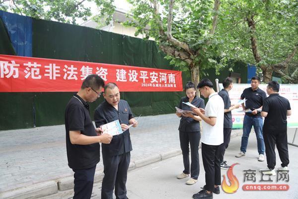 6月14日,永城市人民法院开展防范非法集资宣传活动。干警们结合典型案例“活教材”,从非法集资的表现形式、作案手法、社会危害、预防方法等方面向群众解读,并现场为群众答疑解惑,帮助群众摆脱知识盲区和认识误区,增强风险意识,远离“保本高收益”诱惑,拒绝非法集资,攥紧自己的“钱袋子”。记者 梁晓晨 通讯员 曹萍萍 摄