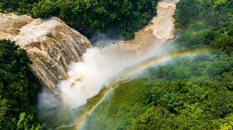 这是6月20日拍摄的贵州黄果树瀑布(无人机照片)。 6月20日,据贵州省安顺市水文水资源局实测数据显示,黄果树瀑布流量最高时达每秒381立方米,为2024年最大水量。