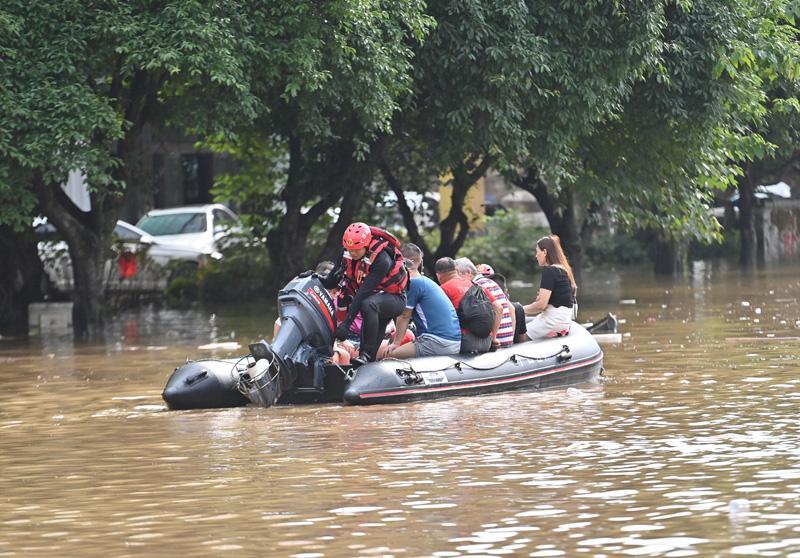 ▶6月20日,在桂林市上海路,救援人员驾驶橡皮艇转移被困居民。当日0时55分,漓江广西桂林水文站出现148.88米的洪峰水位,超出警戒水位2.88米。当地各方闻“汛”而动,全力投入救援。 新华社记者 黄孝邦 摄