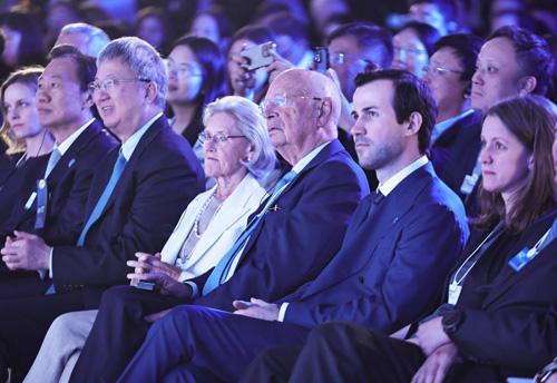 6月27日,世界经济论坛主席施瓦布(前排右三)等在闭幕会上。6月27日,第十五届夏季达沃斯论坛顺利结束全部议程,在大连国际会议中心落下帷幕。新华社记者 杨青 摄