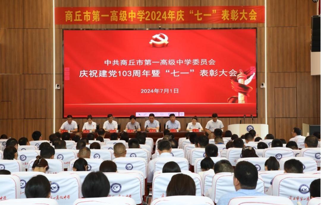 7月1日上午,商丘市第一高级中学举行庆祝中国共产党成立103周年暨“七一”表彰大会。表彰在2023-2024学年中涌现的“先进党支部”“优秀共产党员”和“优秀党务工作者”,激励全校党员同志铭记初心、勇担使命,以实际行动推动新时代教育事业的蓬勃发展。党委书记、校长牛超,领导班子成员及全体党员同志参加,大会由党委副书记、副校长殷传宝主持。
