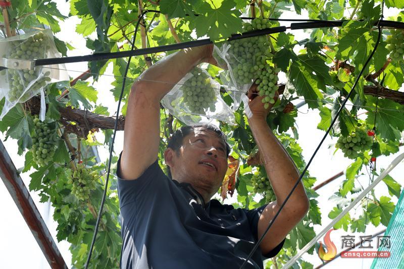 7月2日,虞城县芒种桥乡一晚熟葡萄园,果农正在给葡萄套上白色袋子,丰收在望。葡萄种植户介绍,葡萄套袋可减少果实生长期病虫危害,减轻农药和灰尘污染,保障葡萄果实健康生长,提质增效。