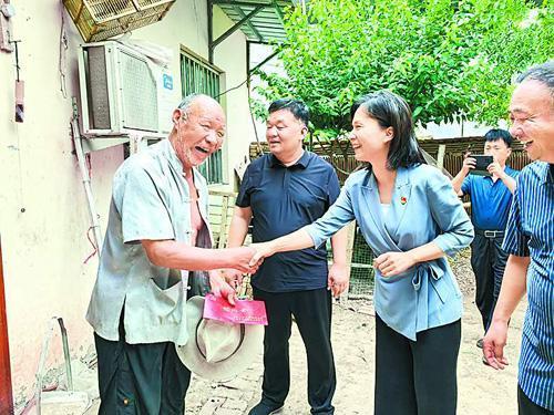 7月1日,梁园区人民法院负责人(右)到乡村振兴联系点观堂镇阮庄村看望慰问困难党员。张艳慧 摄