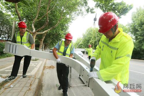 7月2日,民权县城管局亮化服务中心员工在高新区工业大道安装路灯。连日来,该中心工作人员冒着酷暑,加班加点拆除旧路灯,并于7月2日将285基新式路灯全部安装完毕并投入使用。