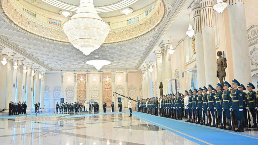 托卡耶夫为习近平举行隆重欢迎仪式。总统府大厅气势恢宏,礼兵威武挺拔。两国元首分别同对方陪同人员一一握手致意。两国元首登上检阅台,军乐团奏中哈两国国歌。习近平在托卡耶夫陪同下检阅仪仗队。