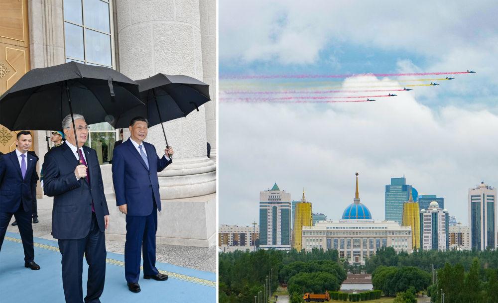 当地时间7月3日,国家主席习近平在阿斯塔纳出席哈萨克斯坦总统托卡耶夫举行的欢迎仪式。习近平乘车抵达总统府时,托卡耶夫总统热情迎接。六架哈萨克斯坦空军战机从总统府上空飞过,拉出象征中国国旗的红黄色彩烟,以最高礼仪欢迎习近平对哈萨克斯坦进行国事访问。