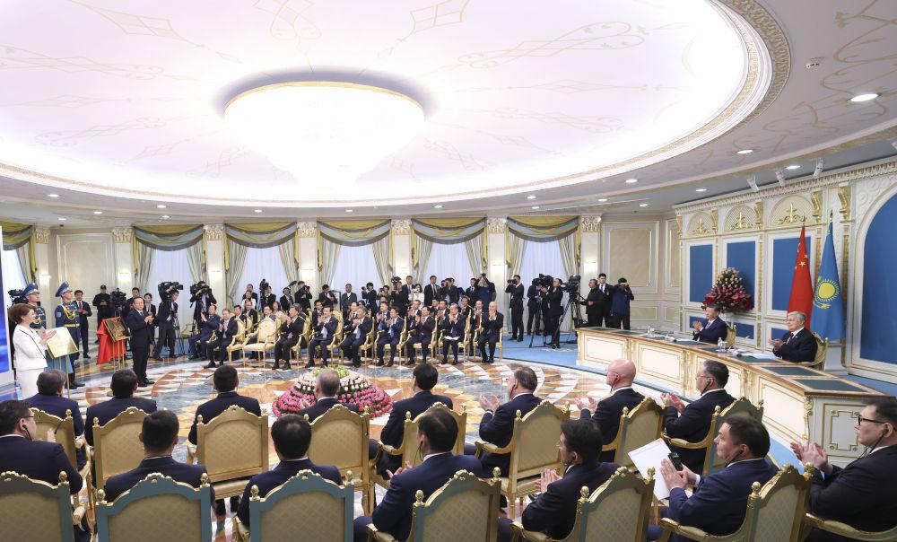 两国元首共同签署《中华人民共和国和哈萨克斯坦共和国联合声明》,并共同见证交换经贸、互联互通、航空航天、教育、媒体等领域数十项双边合作文件。