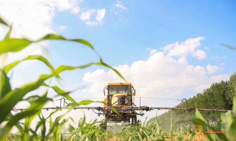 7月4日,雨后初霁,夏邑县会亭镇崔楼村,村民驾驶植保机械在田间给玉米喷施药物,为秋作物丰收打牢基础。