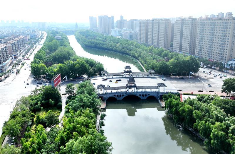 图为无人机航拍夏邑县古运河畔。7月7日,夏邑大地经过雨的洗涤,变得生机勃勃,焕然一新。蓝天白云下,绿树如茵,整个城区呈现出生态美、生活美的宜居景象。