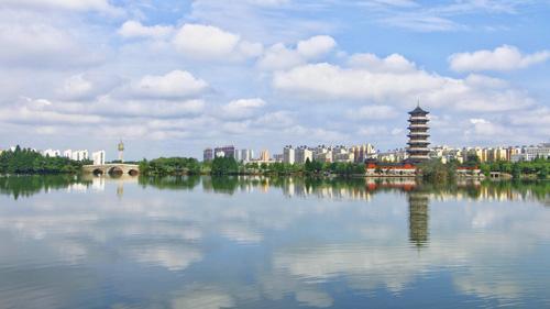 7月6日,雨过天晴。柘城县容湖国家湿地公园上空,飘逸的白云与湖中的倒影、白瓷塔苑相映成趣,构成一幅如画美景图。张子斌 摄