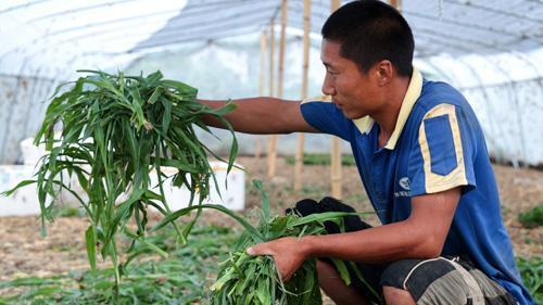 7月9日,青年农民刘红飞正在喂养蚂蚱。2021年,刘红飞在柘城县陈青集镇流转土地70亩,搭建温棚55座,办起“蚂蚱农场”,年收入20余万元。张 超 摄
