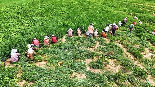 7月8日,柘城县朱襄镇刘山村村民在药材地里忙碌着。朱襄镇以产业兴旺为重点,因地制宜打造“一村一品”,蛋鸭养殖、大蒜种植、药材种植等特色产业不断涌现,聚力农民增收,促进土地增效。张超 摄