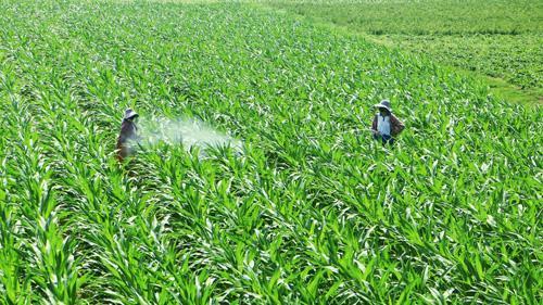 7月7日,村民在柘城县朱襄镇张白村玉米田里喷洒农药和植物生长调节剂。由于近期雨水偏多,该县农业农村局及时组织农业科技服务人员深入田间地头,指导农民做好田间管理。张子斌 摄