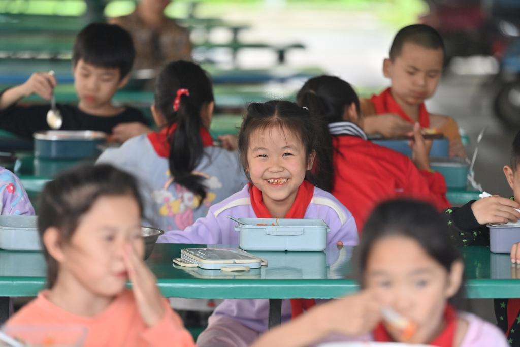 5月31日,广西柳州市柳江区三都镇觉山教学点,学生们在吃营养午餐。