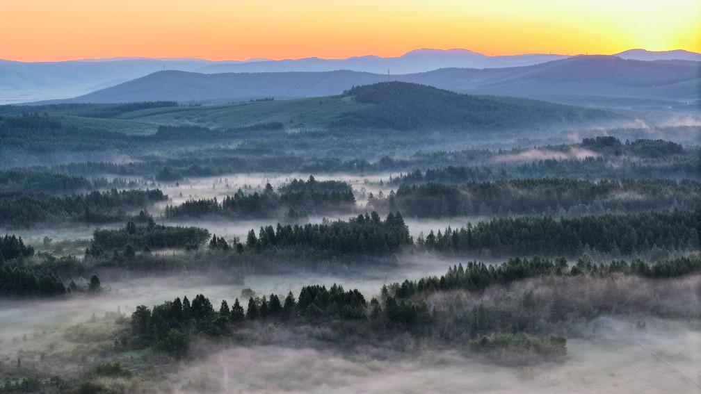 7月5日清晨,位于河北省承德市的塞罕坝国家森林公园雨后晨雾飘渺、满目青翠(无人机照片)。