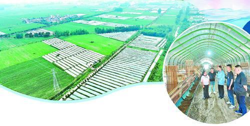 ▲曹东村种植产业园鸟瞰。本报融媒体记者 张壮伟 摄 ▶乡、村两级干部在湖羊养殖场调研。本报融媒体记者 韩 丰 摄