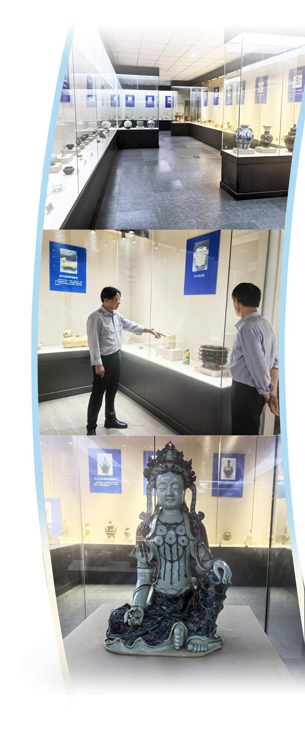 ①尚瓷文化艺术馆展厅。 ②尚瓷文化艺术馆馆长温杰(左)为游客介绍展品。 ③尚瓷文化艺术馆镇馆之宝——元代元青花釉里红持莲观音像。