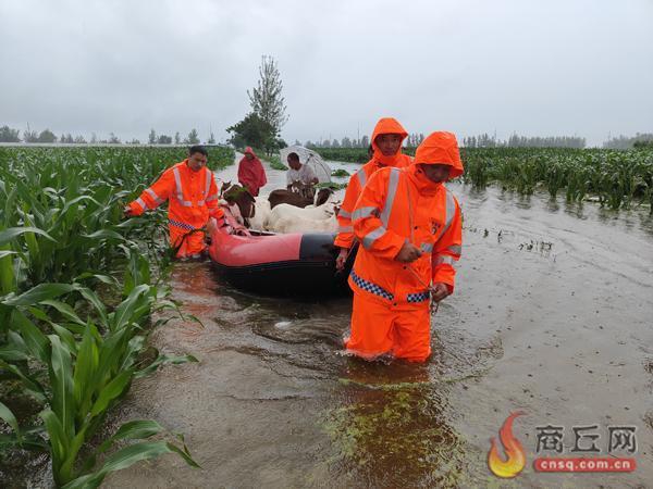 救援队伍在大沙河睢阳区包公庙段开挖泄洪沟渠。 商丘市消防救援支队供图 柘城县应急蓝天救援队在转移受困群众。张子斌 摄