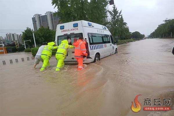 7月16日上午9时许,商丘雷锋义务救援总队组织了一支由13名队员和8辆救援车组成的突击队及时到容易积水的华商大道和神火大道交叉口附近,由大队长赵永利带队现场实施救援。这里积水很深,很多车辆熄火抛锚,还有很多电动车在水中不能前行。他们通过越野车拖拉以及人工推,帮助车辆越过积水区。截至当日下午3时,商丘雷锋义务救援总队已救援车辆100余台。