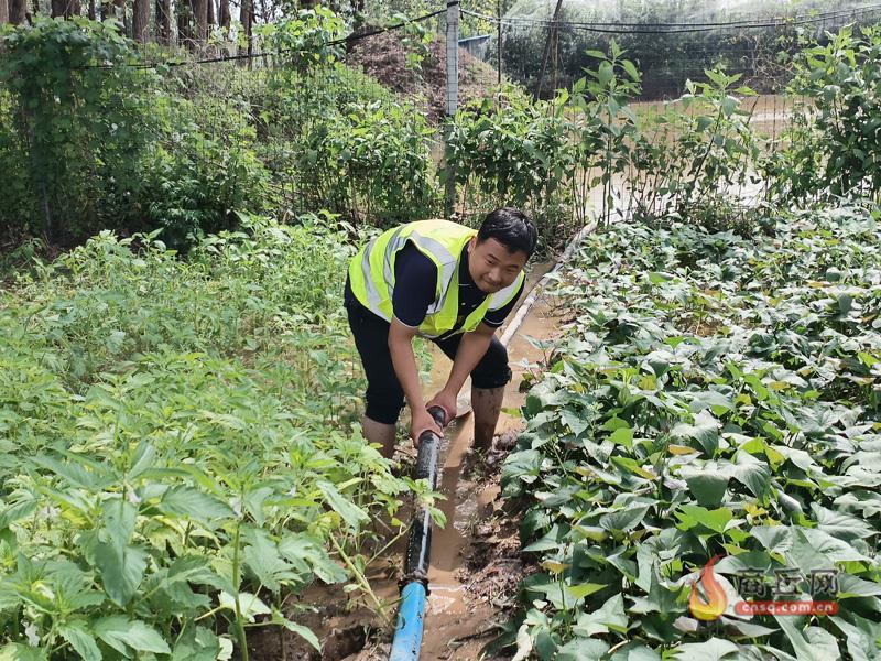 ◀中国太保产险商丘中支工作人员在帮助村民排出田间积水。 本报融媒体记者 霍天艳 摄