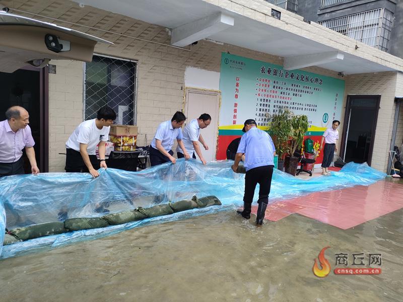 面对汛情,党员、团员冲锋在前,保障金融服务不断档。永城市永兴支行网点负责人孔矿飞带领员工防汛抢险3个多小时,保护了网点财产,保证了当天正常营业;夏邑县支行车站分理处齐心协力防汛排水,既保护了网点财产安全,又保障了金融服务不断档(如下图 霍天艳 摄);商丘开发区支行班子成员靠前监督,到辖内网点检查防汛情况并看望慰问一线员工;宁陵县支行第一时间组织检查电路设施、档案室重要凭证安全情况,为各网点紧急采购沙袋、雨衣等防汛物资,保障了安全生产和金融服务的连续性;虞城县支行成立两个突击应急组,奔赴站集分理处、木兰支行等汛情较为严重的网点进行帮扶,调来挖掘机、抽水泵,及时设堰排水,确保网点安全。