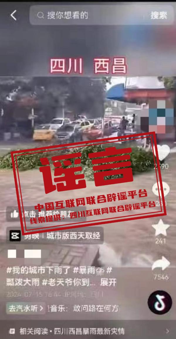 近日,有网民发布一条视频,显示两人利用被吹断的大树枝在街道上乘汛漂流,并在视频上方标注了“四川西昌”的字样,引发网民关注。经调查,该视频系网民蔡某为博眼球、吸流量,利用短视频编辑软件上的模板剪辑而成,并在短视频平台进行传播,造成不良社会影响。当地公安机关依法对其进行处罚,并已责令其删除谣言信息。(来源:四川互联网举报辟谣平台)