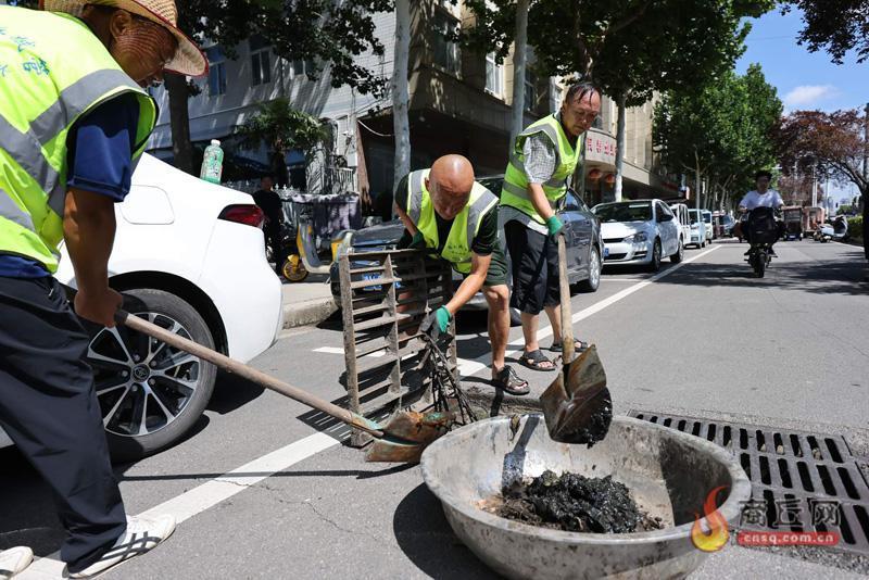 7月29日,在归德路旁,工人正在清理下水管道内的淤泥。降雨过后,我市职能部门积极行动,采取机械和人工清理相结合的方式,疏通排水管道,确保排水通畅。
