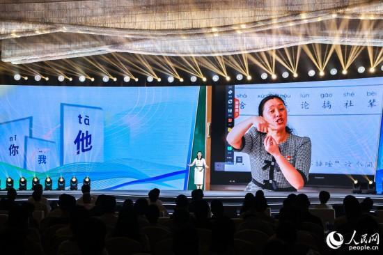 丁海燕讲述互联网给聋哑儿童带来的改变。人民网摄
