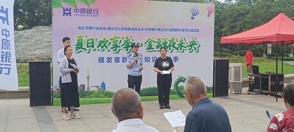 近日,中原银行商丘分行消保小分队联合商丘市银行业协会、商丘市公安局新城派出所前往市区某广场,组织开展“夏日欢享季·金融夜未央”为主题的银发客群金融知识宣传公益活动。
