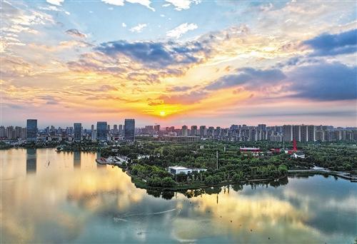前日傍晚,天空出现晚霞,在日月湖水的映衬下,美如浓墨重彩的油画。